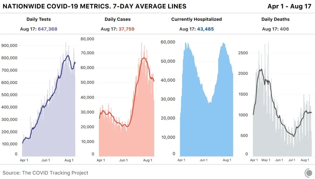 美国的疫情数字转入缓和,日检测能力平稳上涨,维持在75-80万检测量的水平;7日平均日确诊人数从7月接近7万人的高峰回落到5万;7日平均住院人数下降到5月初的水平,目前全美整体因新冠住院的人数为4万多人;7日平均死亡人数在每日1000人上下,最近几日报道的死亡数字跌落到500人以下。