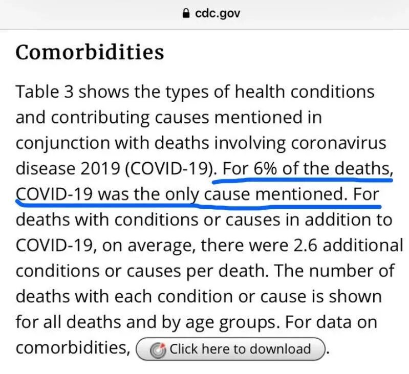 CDC也同时公布了,在所有新冠死者中,6%的人是只有新冠无其他疾病的人;其余94%的人平均有2.6项除新冠之外的其他的对生命也会造成威胁的因素。