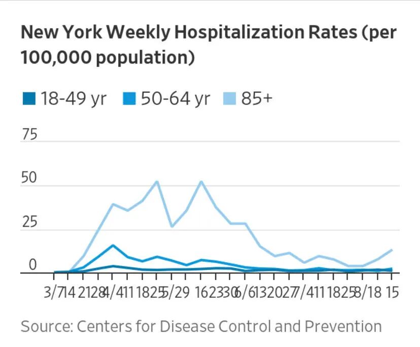 以纽约为例,CDC记录的每周包括新冠病人在内的所有住院人数,还是以85岁以上的老人为大多数。全美其他地方情况也雷同。