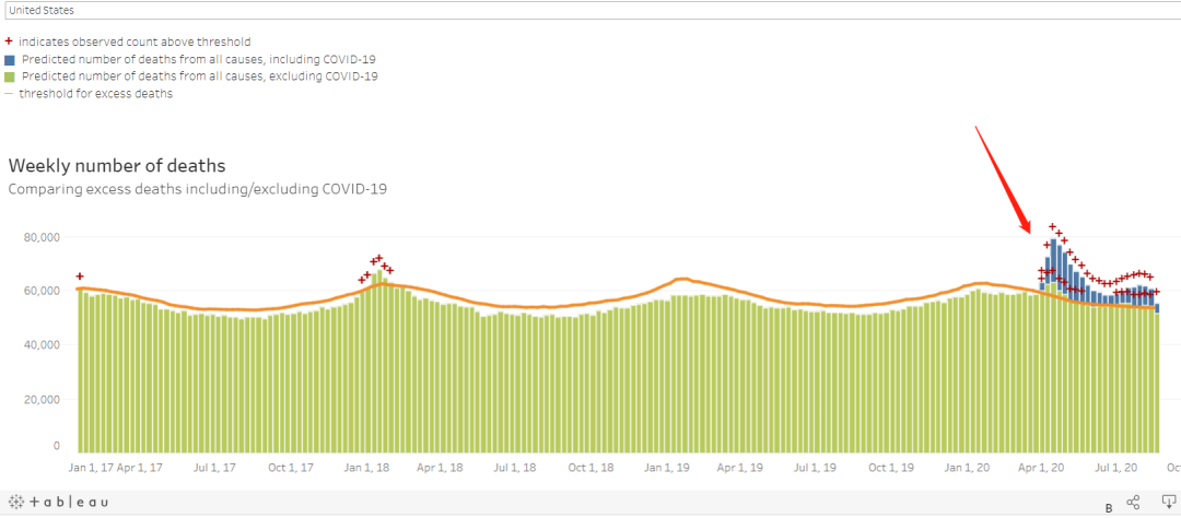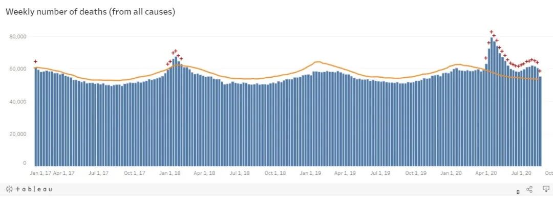 CDC网站上有对每周全美死亡人数的数据统计,从2017年1月到2020年8月中旬的数据来看,今年从3月底开始,死亡人数明显超过一般预期水平。