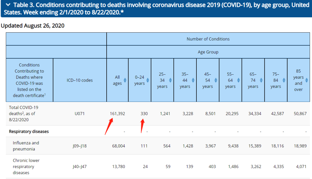 0-24岁年龄段,全美到目前一共去世330人,所以这就是阻挡不了年轻学生返校违规开party的原因,但是对老师构成的威胁不小,这也是纠结复学的因素所在。