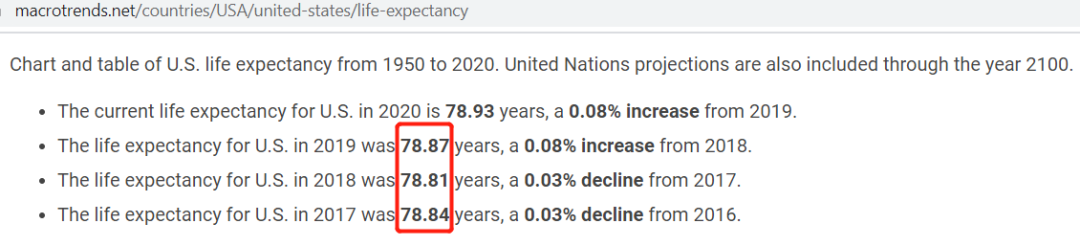 而美国人的人均预期寿命在78.8岁上下浮动。这就意味着,新冠对于病人平均寿命的影响,基本在几个月到几年的水平,但需要专业计算,非本文讨论范畴。