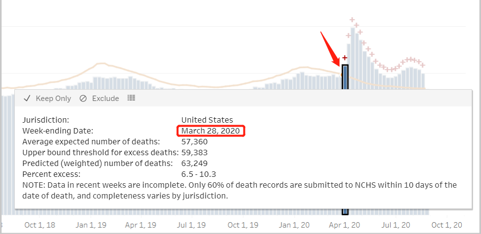 这番联邦政府与地方州权之间的交锋,发生在3月28日,而那一周,恰好就是美国超常死亡人数从正常水平开始激增,一直持续到现在的起始点。