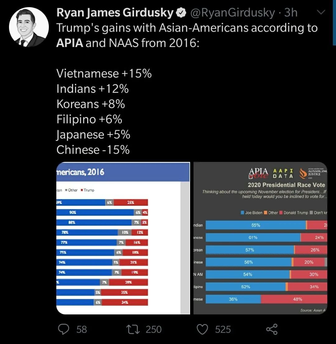 推特上有人将数据做了进一步的总结,结果发现,亚裔中多个族裔对川普的支持率比较2016年都有上升,其中越南裔增加15%,印度裔增加12%,韩裔增幅8%,菲律宾裔提高6%,日裔上升5%。但是,华裔支持率下跌了15%。是亚裔中唯一下降的一支。