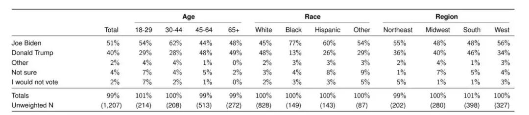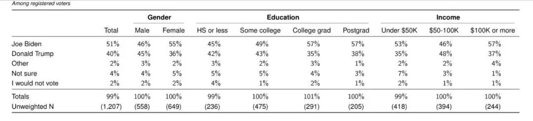 从中可以看到,按照家庭收入分,5万以下和10万年收入以上的人群,都更多地支持拜登(分别为53% vs 35%和57% vs 37%)。但是美国中等收入的人群,5万到10万收入的人,则支持川普略多,48% vs 46%。2%属于统计误差范畴,但是考虑到这来自一个整体上拜登以两位数百分比领先川普的民调,还是颇能反映问题。