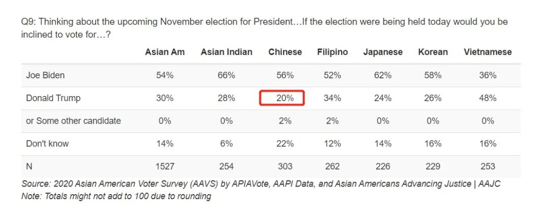 查了一下,华裔支持川普的比例为20%。而多次针对华一代的微信和电报群的非正式民调显示,华人新移民支持川普的比例大约在60-65%之间。所以这个亚裔组织的调查大概主要面向的是本土华裔,很可能其中覆盖到的华人新移民(归化的公民)比例很低。