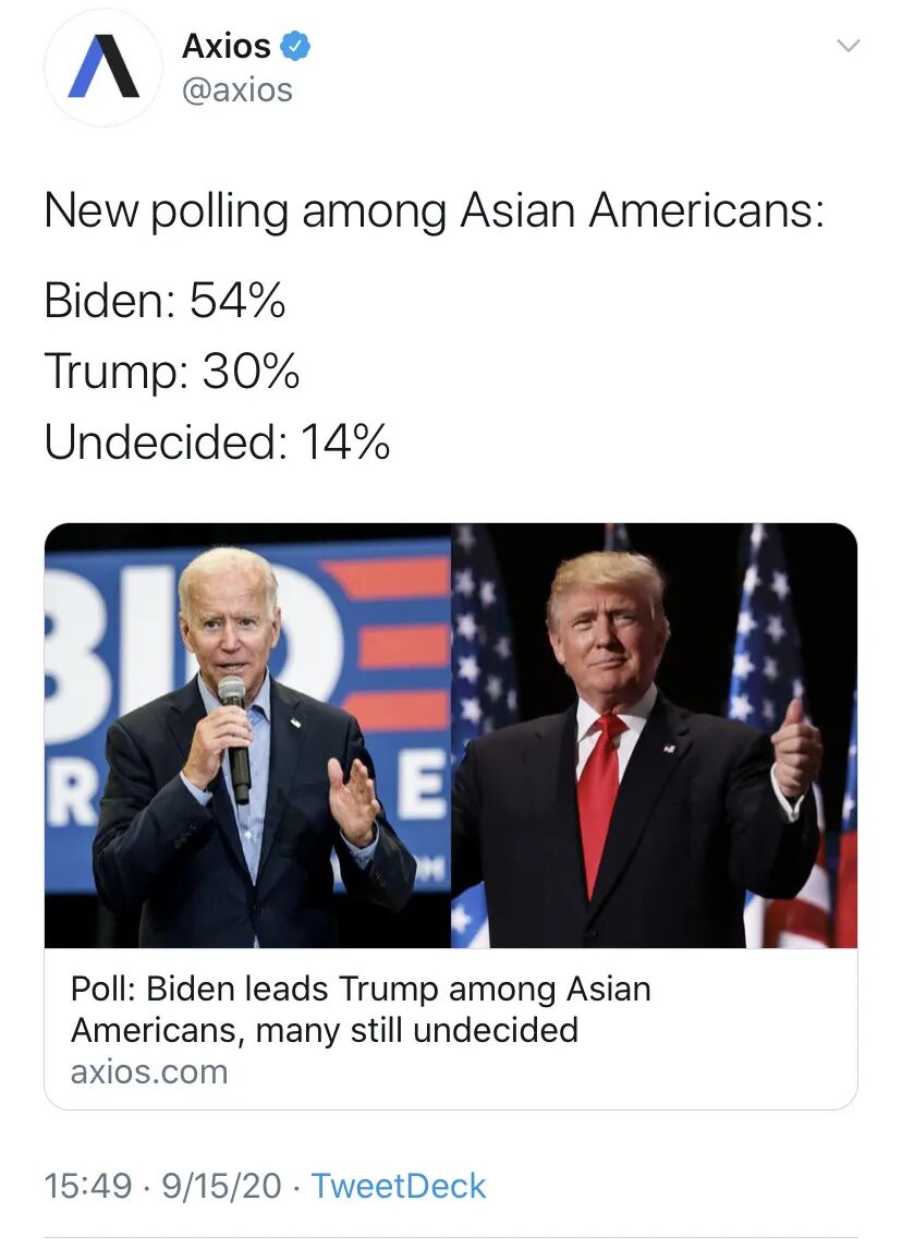 1. https://www.axios.com/poll-biden-trump-asian-americans-31b426be-1bf7-4eee-8a80-71c93c8a8979.html?utm_source=twitter&utm_medium=social&utm_campaign=organic&utm_content=1100