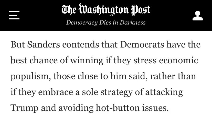 最近,曾经是党内初选中拜登的最强对手,沃蒙特州的国会参议员桑德斯接受采访时候犀利地指出,“如果民主党人更加强调经济民粹主义,而不是重点放在一味地攻击对手并造成对其他热点问题的忽视,将更大程度地提高获胜机会。”