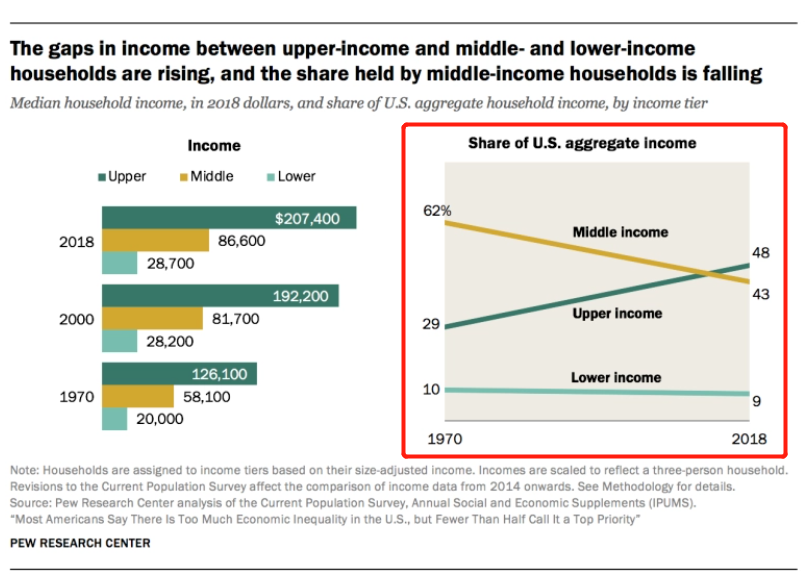 右框显示,过去半个世纪,美国中产阶层所占社会财富比例缩水近20% 来自皮尤中心