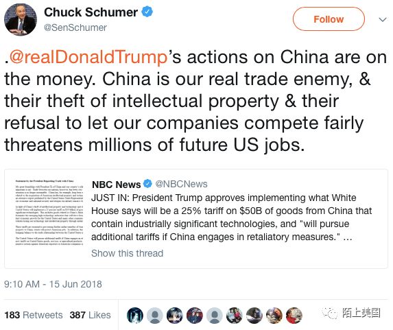 这次关税消息一出,立刻引起了参议院少数党领袖查克舒默(Chuck Schumer)的高度赞扬。而这位纽约民主党人,在其他方向上一惯是坚定的川普政策的批评者。