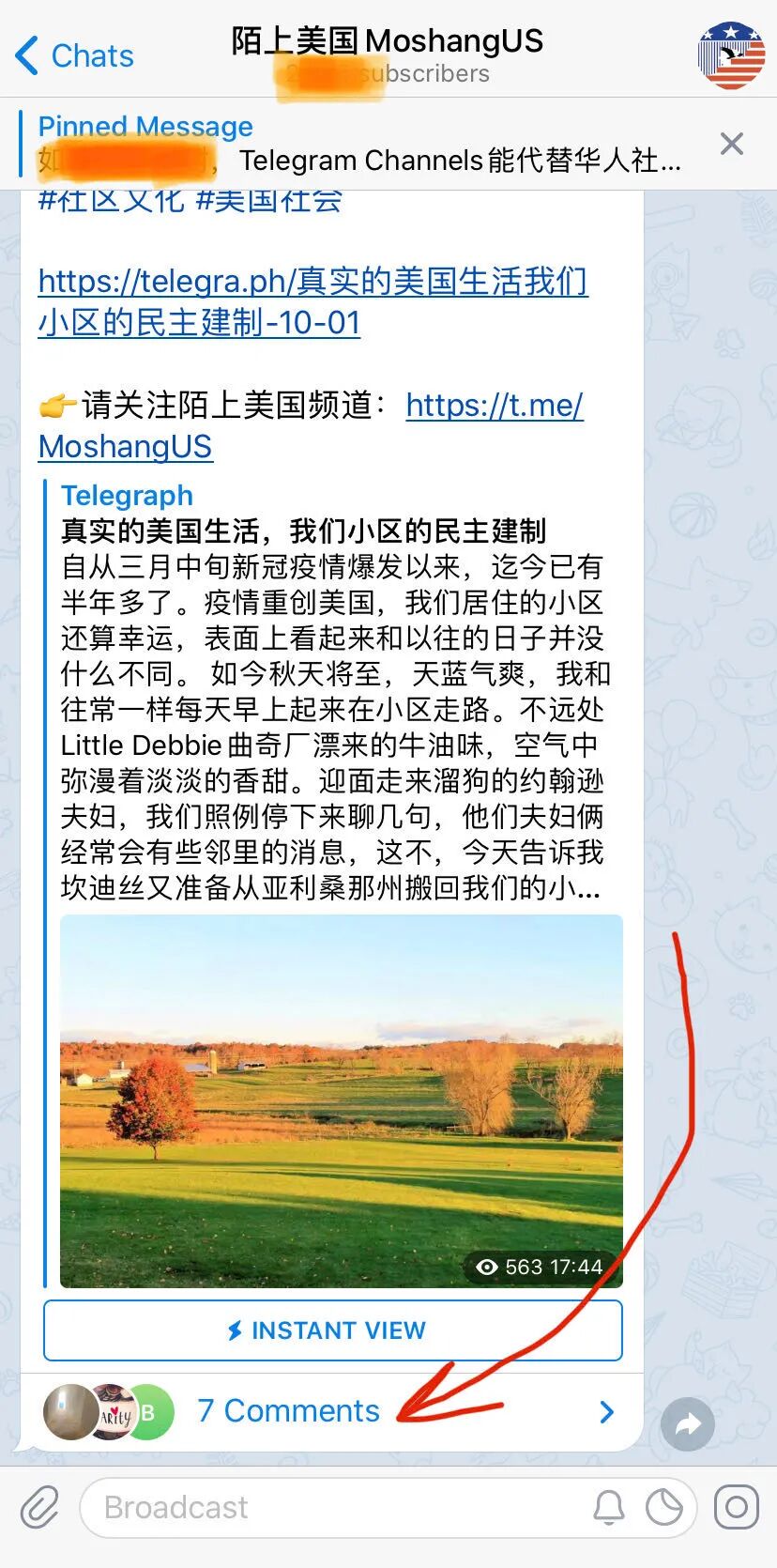 设置好以后,频道推送的文章都带有了评论(comments)功能(下图红色箭头所指)。给文章的评论会出现在对应的讨论群里面,同时只订阅频道但不加入讨论群的人也一样可以看到文章对应的评论。而在群里的人引用这个文章回复,留言会自动变成文章评论的一部分。