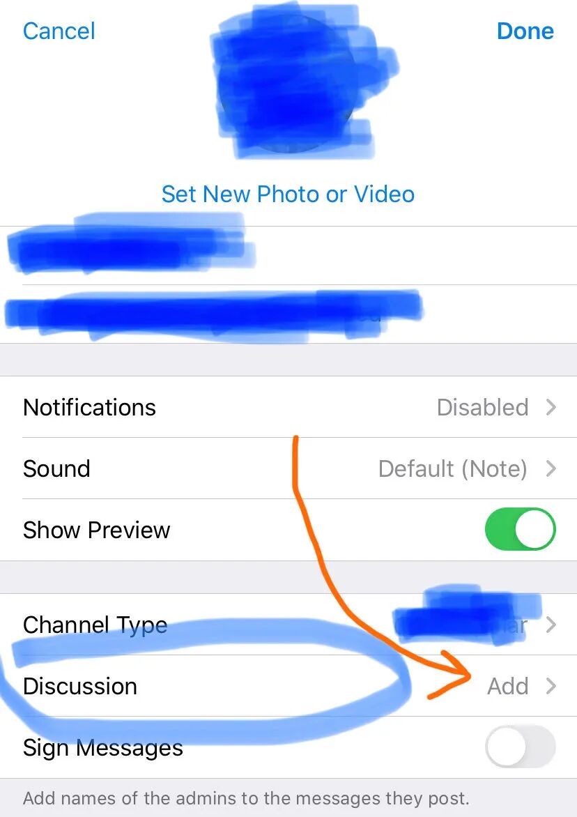 今天恰好电报升级,通过频道发布的文章也自带评论功能了。操作方式是,先给你的频道添加一个群。首先从频道的Edit界面进入,在“讨论(Discussion)”一项的地方(下图蓝色圈),选择“添加(Add)”(下图红色箭头所指),即完成给你的频道加上一个对应的讨论组群(跟其他任何电报组群类似,成员人数上限20万,可以在里面展开各种话题的讨论):