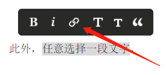 除了以上的小窍门,还可以给文字插入链接、改粗体、调整字的大小、变成引用等。方法是,用鼠标任意选择一段文字,被选部分出现灰色阴影,同时其上端跳出选项。这个时候可以根据自己的需要选择不同的功能,比如,下图箭头所指的加入链接,这个功能很实用。