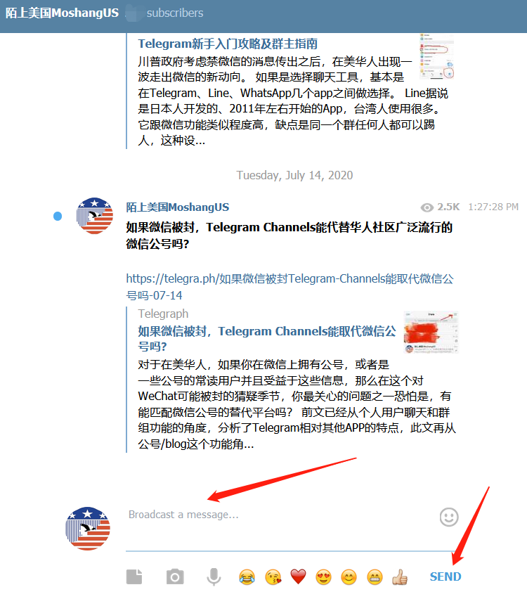将文章的这个地址和对文章的导读介绍贴到电报频道的broadcast的地方(下图中红色箭头所指),点击“Send(发送)”,就完成一条新的频道更文推送了。
