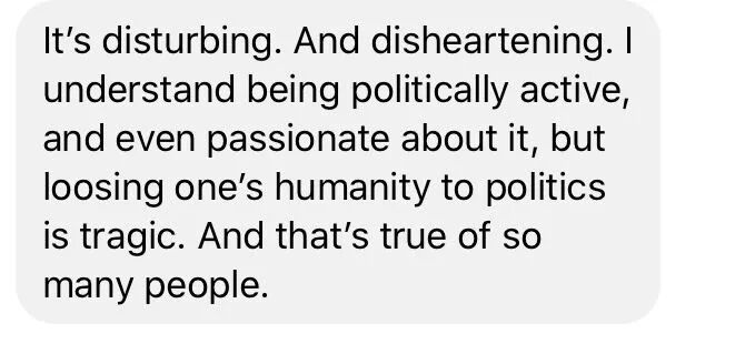 “情况令人不安且沮丧。对政治的关心、热情是一回事,但是因此失去基本的人道是可悲的。竟然有那么多人如此深陷。”