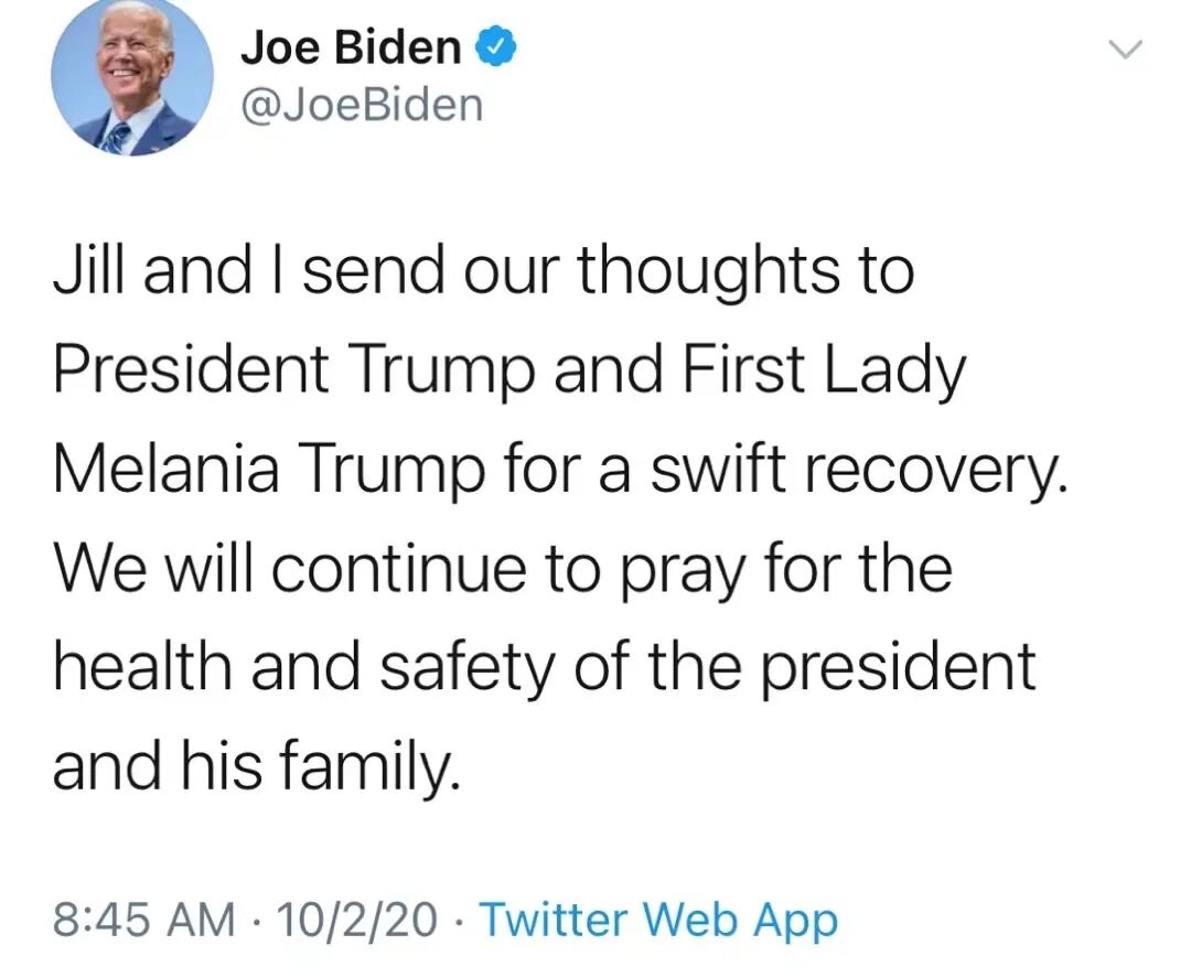 美东时间早上八点半,拜登发推特问候川普,祝福他早康复。其他民主党高层人士当时暂都没有动静。