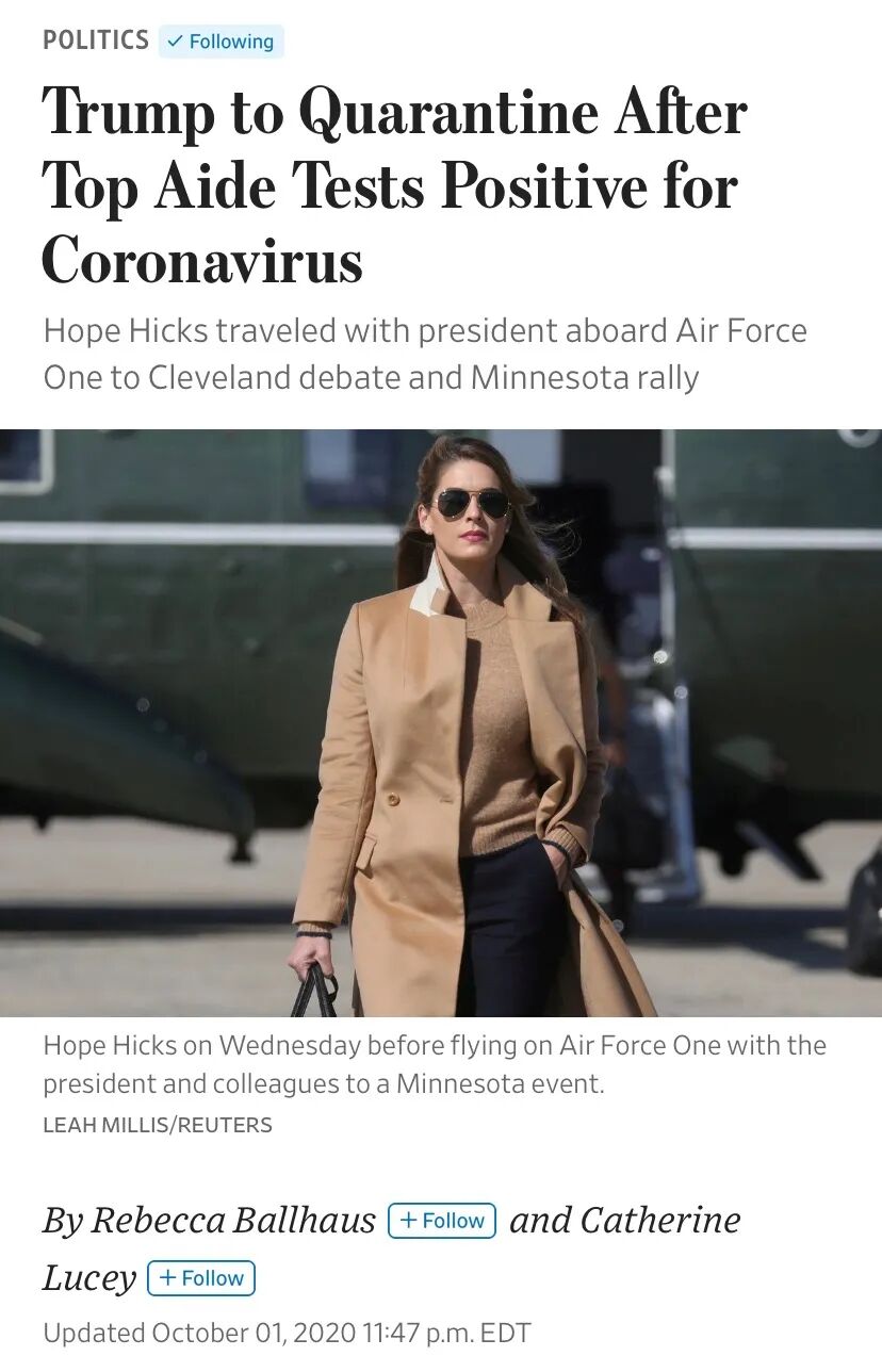 10月1日这天,新闻曝出川普的高级白宫助理Hope Hicks确诊Covid-19新冠病毒的消息。