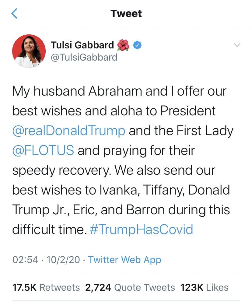 第一个发帖为川普祝福的民主党知名政客是陶西·佳博德,她在深夜发推特,对川普全家表达关切和问候。
