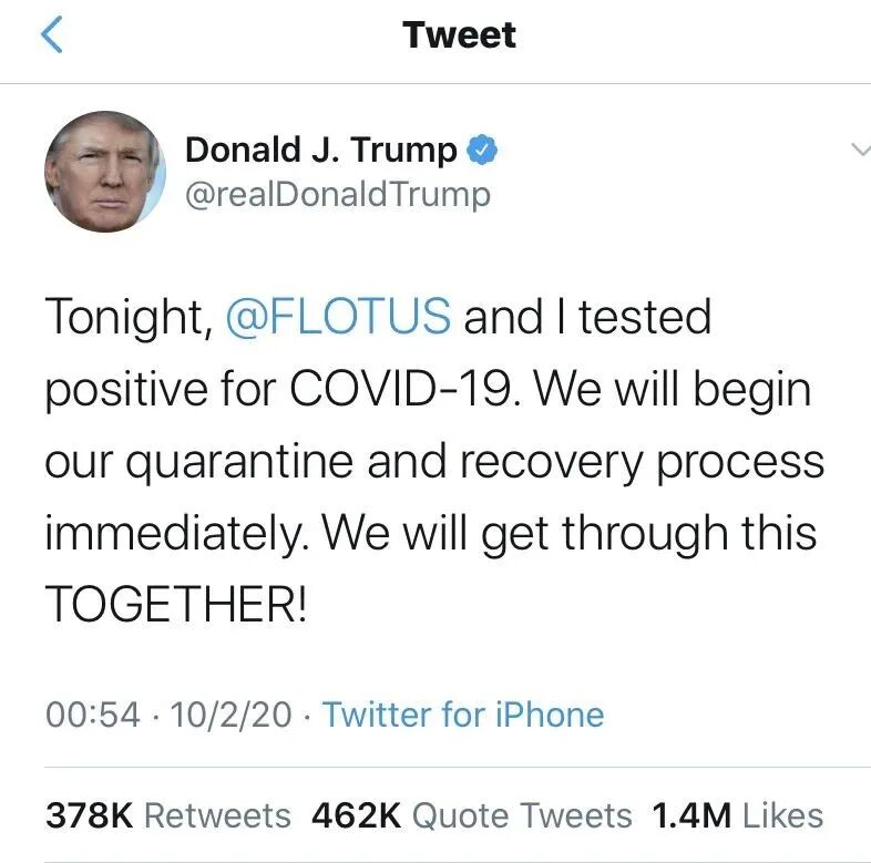 三小时之后,川普再度发推特,说自己和第一夫人都确诊新冠阳性,会协力一起战胜病毒!