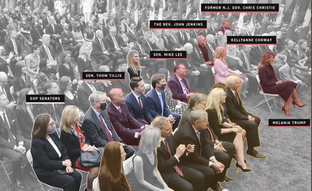 自从美国第一家庭中招新冠病毒(点击前文),很快病毒爆发源头就被破案了,是之前9月27日在白宫罗莎花园举行的大法官任命庆典(点击前文)。