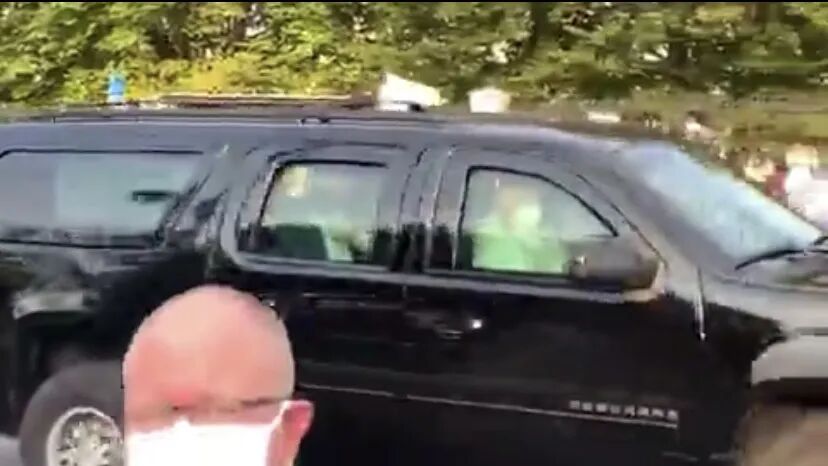 周日临近傍晚时间,川普走出病房,给在医院外不分昼夜地给他鼓劲加油的粉丝们一个惊喜,他坐在车里向支持者们挥手致意了一圈,感谢他们的善意。总统专车像个临时的ICU,陪同的警卫人员和司机都带着N95医用口罩并穿着防护服,以避免感染。但是这个举动再度遭到媒体批评,说他给工作随行人员增加感染的风险。