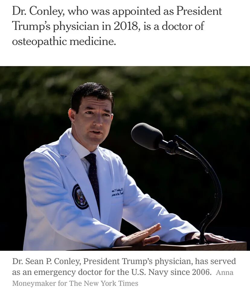 看到有的中文自媒体直接把白宫医生说成是“骨科”出身,这里是翻译理解出错了。川普的医生是个80后,肖恩·康利(Sean Conley),毕业于美国历史最悠久的医学院,私立的费城医学院(Philadelphia College of Osteopathic Medicine)。虽然是白宫历史上第一个O.D.(osteopathic medicine)出身的总统首席大夫,但是O.D.跟M.D.受到的科班训练类似,不同之处在于从人的整体上看待身体及其护理,而不光是为特定的症状或疾病开药。美国医生中有接近20%为O.D.,其余为M.D.。