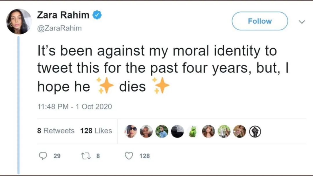 而激进的反对者也没少表露出来真实的本性,希拉里和奥巴马的前助理也是希拉里2016年的新闻发言人的扎拉·拉希姆(Zara Rahim),就在推特上表达希望川普死。因为遭遇强烈反弹,她自己把推特关闭了。