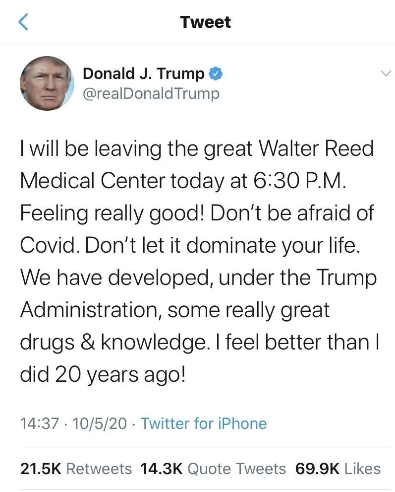 十分钟前,川普发推,称自己下午美东时间6点半将出院,他还不忘加了一句“不要担心Covid,不要让它统治你的生活......我觉得自己的状态比20年前还棒!”
