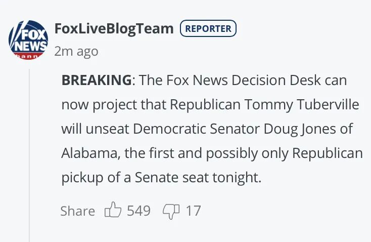 11点20分,福克斯新闻宣布,共和党将在阿拉巴马州(AL)扳回一个参议员席位。汤米·图伯维尔(Tommy Tuberville)战胜道格·琼斯(Doug Jones),终结了琼斯短暂的2年参议员之路。