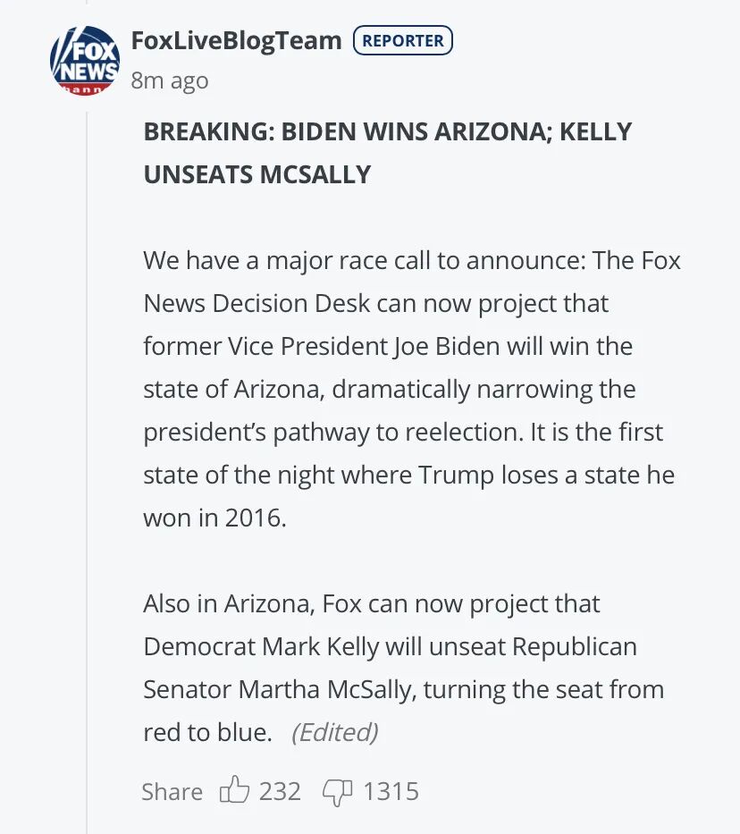 到了3点,AZ情况又一次逆转,美联社和福克斯新闻再次宣布拜登将获胜,这是第一个被拜登翻蓝的2016年投川普的州,同时也是1996年以来民主党就没有赢过的红州。川普一定会十分后悔自己当年没有礼待麦凯恩参议员,得罪他家也让自己失去举足轻重的一州,这甚至可能危及他的连任机会。