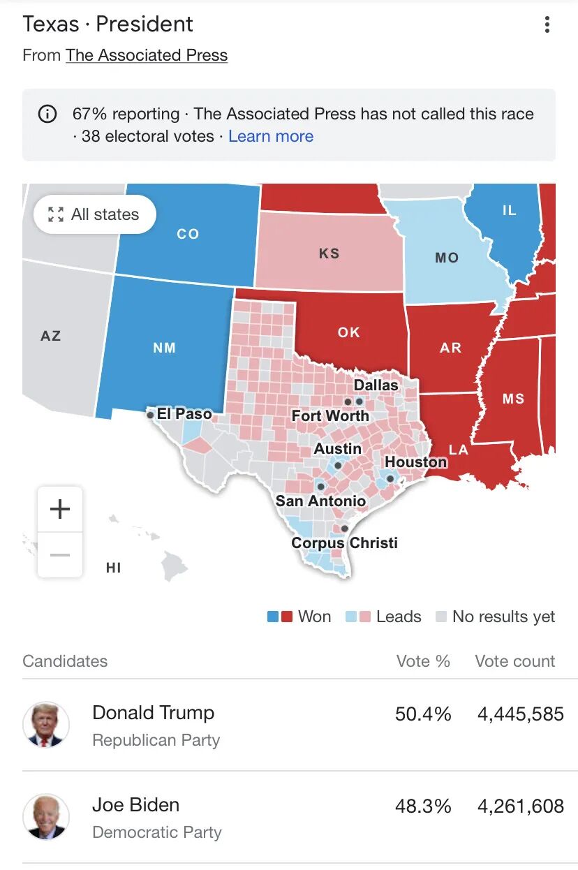 晚上十点,两党在德州开始拉开距离,共和党获得优势。南卡参议员林赛·格雷厄姆(Lindsey Graham)此刻也过关了他的参议院连任竞选,挑战他的民主党人海梅·哈里森(Jaime Harrison)获得的竞选资金比他多出8600万美元,依然饮恨。