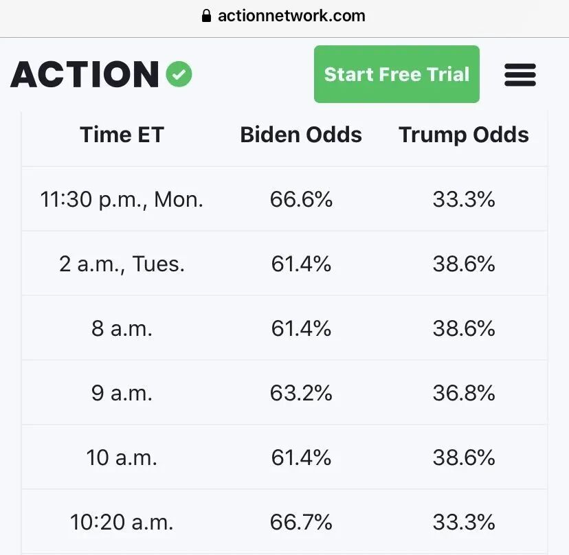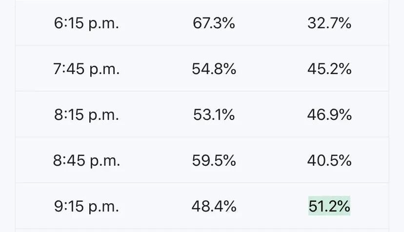 随着德州归位红色,赌盘胜率上,川普首次反超拜登的赢率。