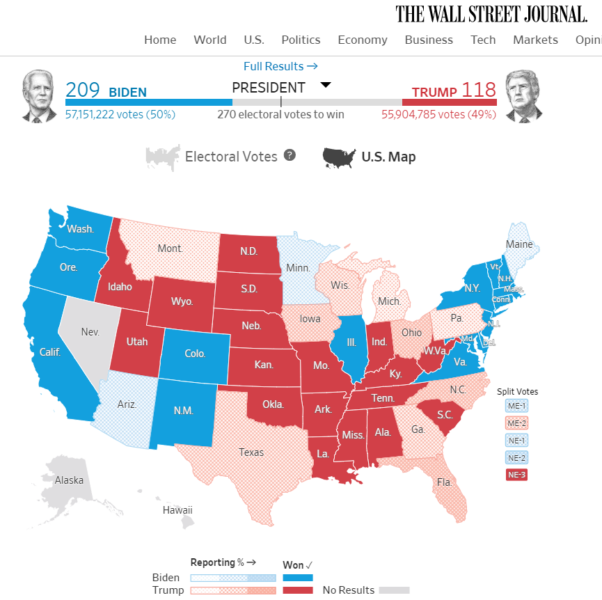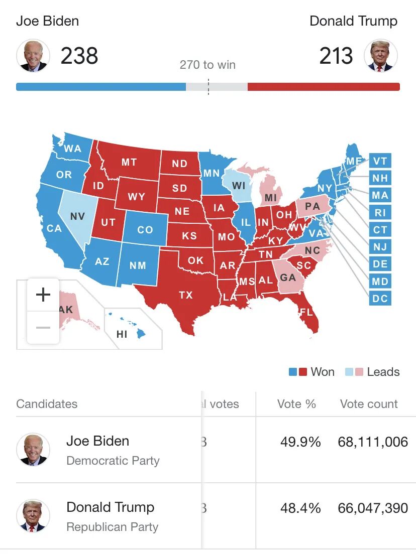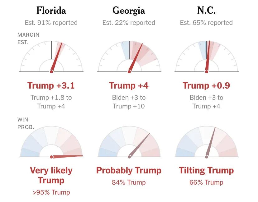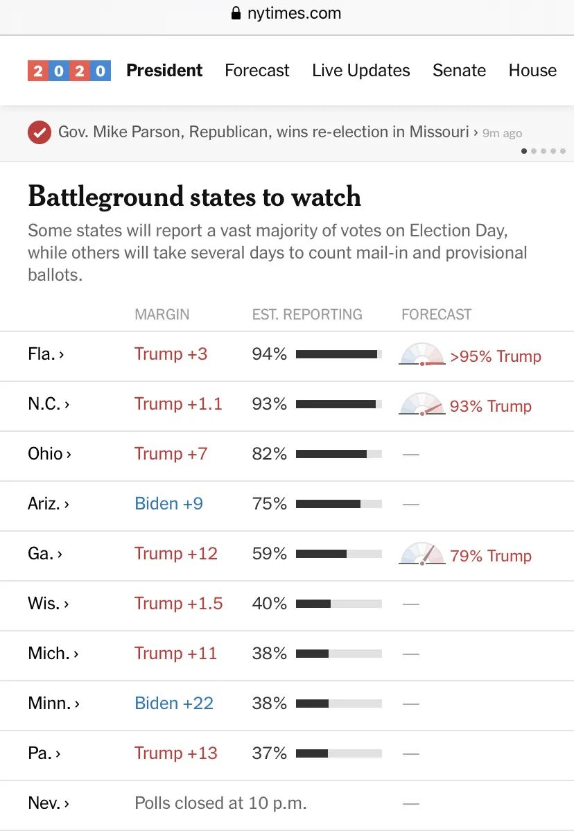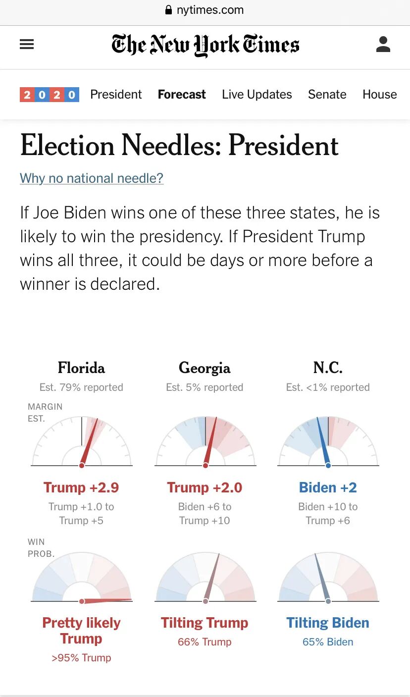 FL,NC,GA是纽约时报定的风向标,如果拜登赢其中1-2个,川普连任的机会大幅度下降。结果到凌晨3点,GA的情况依然悬而未决。