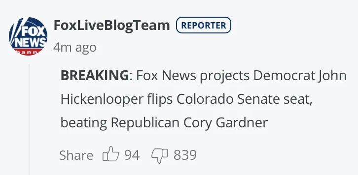 与此同时,福克斯新闻报道,科罗拉多州的国会参议院席位翻蓝一席。参加了民主党总统候选人初选的科罗拉多州的前州长约翰·希肯洛珀(John Hickenlooper),战胜谋求连任的共和党人科里·加德纳(Cory Gardner),这让共和党在参议院53席的优势开始减弱,不过这个结果算预料之中。