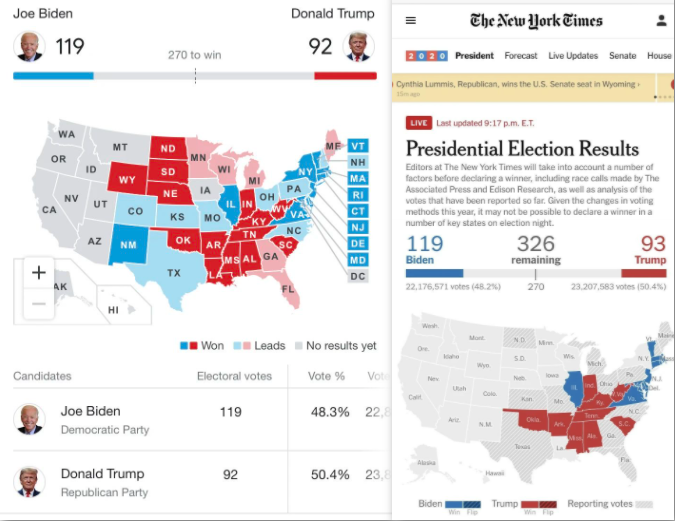 这个时候美联社给出的及时战局预测(左)比纽约时报(右)偏向于民主党。