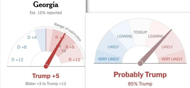 不过戏剧化的是,12点22分,福克斯新闻又撤回该预测!亚利桑那州依然胜负难定。与此同时,纽约时报也改变了对佐治亚州的判断,将更大的获胜概率拨回给拜登。此消彼长,扣人心弦。