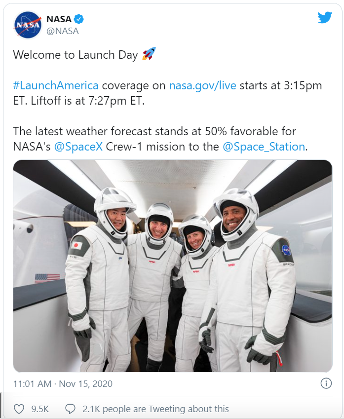 发射时间定在美东时间下午7:27分,地点依然是佛罗里达州肯尼迪航天中心。根据规定,Covid-19新冠阳性患者不被允许进入航天中心。马斯克因为最近测出阳性和阴性混合的结果,因此今天将无法到现场观摩发射。