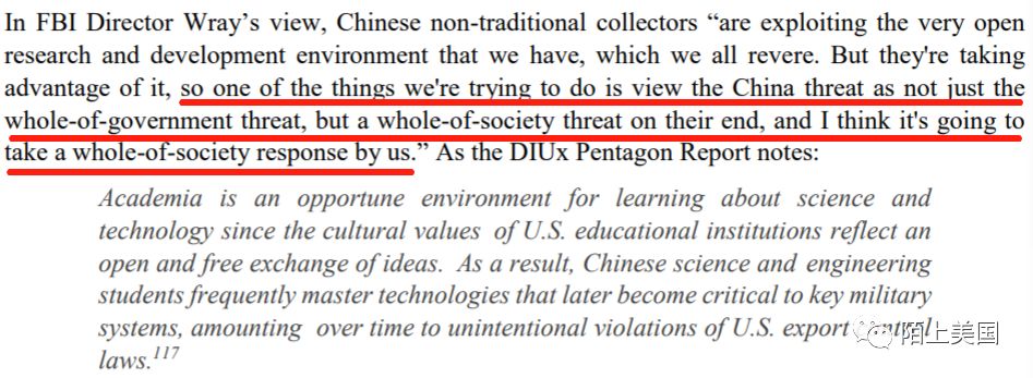 FBI局长Wray的话又一次被拿出来:“我们试图做的事情之一是把中国的威胁视为不仅是整个来自他们政府的威胁,而是一个全面的中国社会的威胁。我认为这需要美国有一个全面的、全社会配合性的回应。”