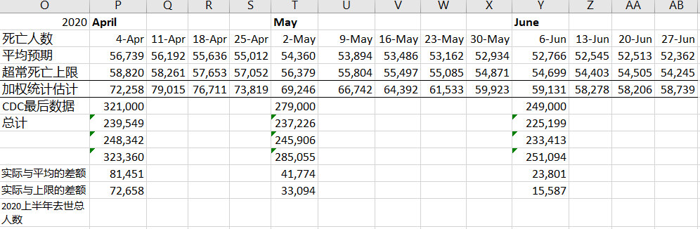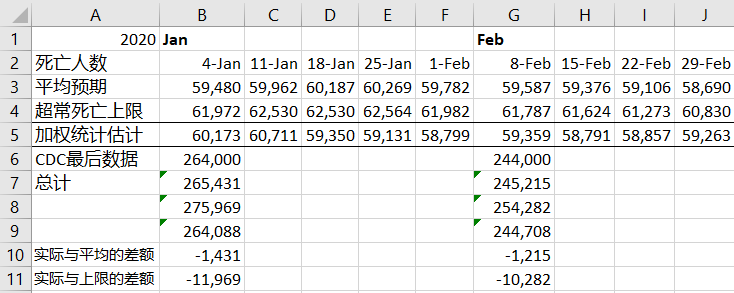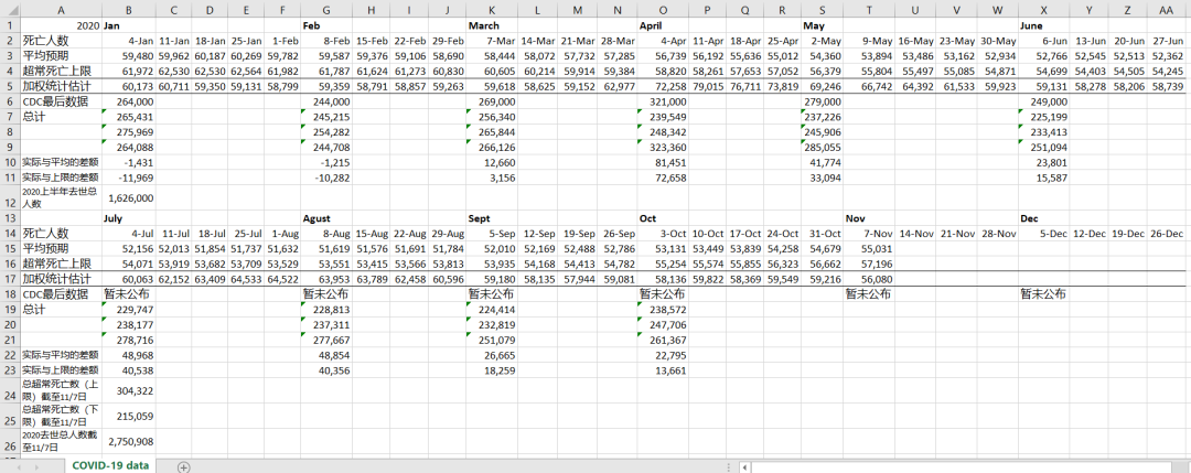 结果显示,截至2020年11月7日(CDC没有提供之后的数据),今年美国已经去世了275万人(其中1-6月为CDC校正过的数据,7月-11/7日为CDC每周统计数据直接相加;参考上图中B26格数据,以及【1】)。