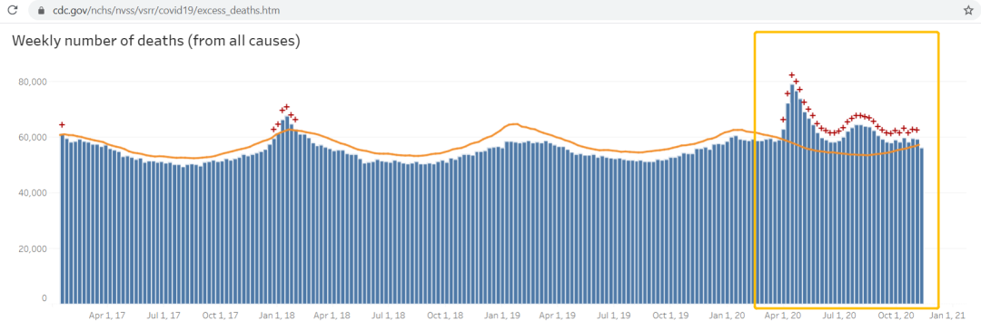 这也符合CDC给出的今年截至11月7日的总超常死亡人数的上下限预计,在21.5-30.4万人之间浮动(参考上图中B24、B25格的数据,以及【1】)。而全球新冠疫情统计网站显示的美国因为COVID-19病毒死亡的人数到11月7日这天为止,是24.3万【2】。
