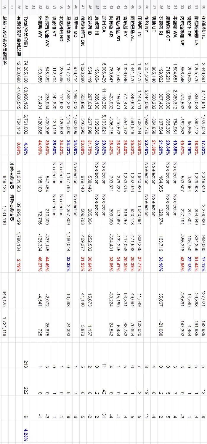 笔者统计了一下有参议员换届选举的这34个州的投票结果,川普得票为4233万票(下图B56格),而34位共和党参议员候选人(除去了GA特别竞选的计票)总共得票为4168万票(下图G56格)。因此,川普比34位共和党参议员候选人总得票上多64.9万票(下图G58格)。