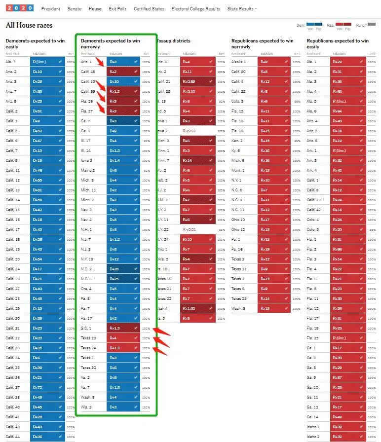 本次众议院的选举结果也证明了,共和党比2018年中期选举时候受欢迎。而被《纽约时报》定为民主党可以以小优势赢下的众议员选举中,却有至少7个席位被共和党的候选人翻红。