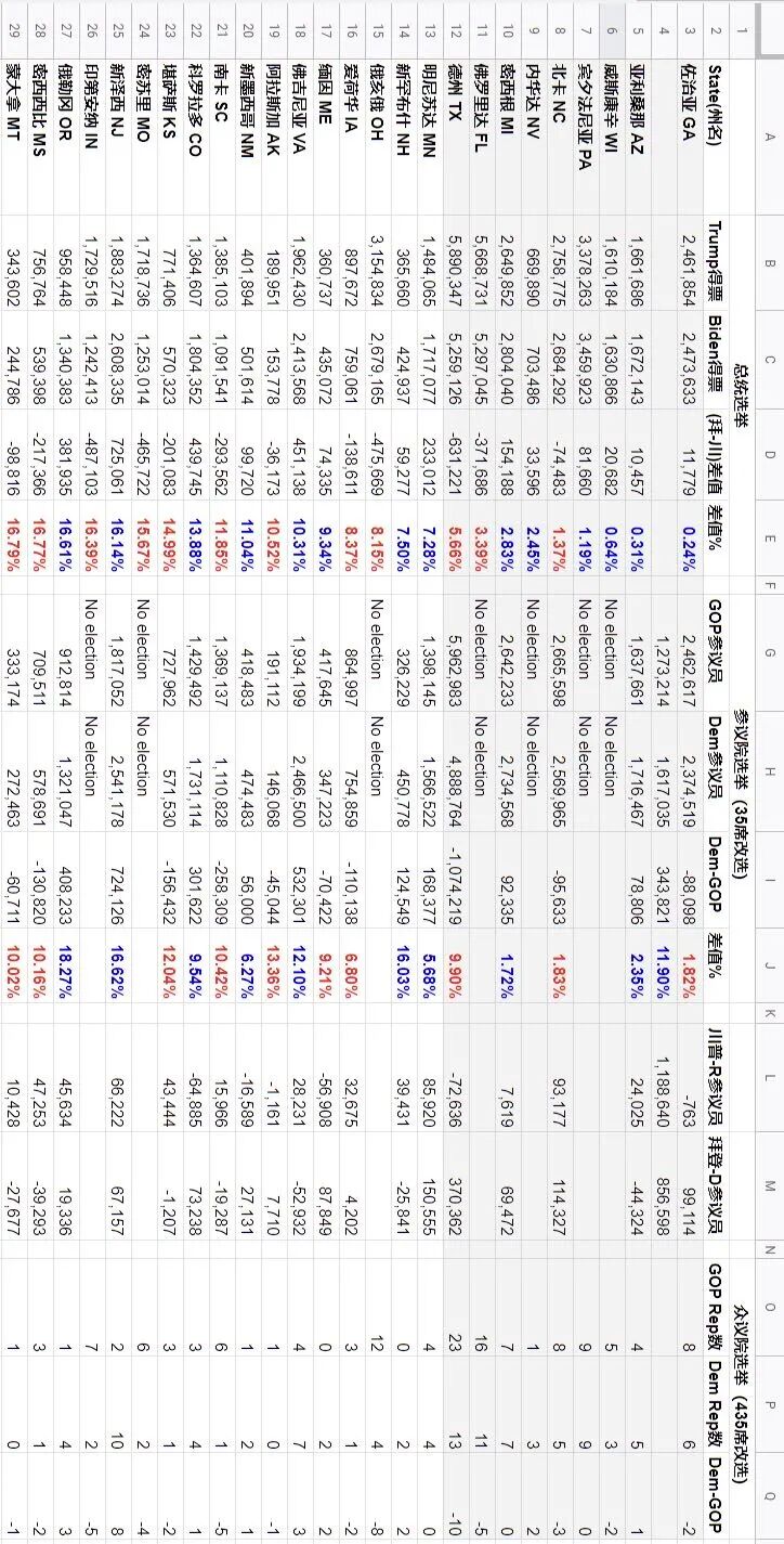 根据美联社(AP)公布的数据,笔者整理了一下各州的总统选举、国会两院选举结果(参考文末图表,已经用写论文的精神核对过数据,童叟无欺)。这篇只就目前公布的情况做纯数据的总结分析,笔者会争取在后续的文章中,点评几个战场州有关大选舞弊听证会的实况。
