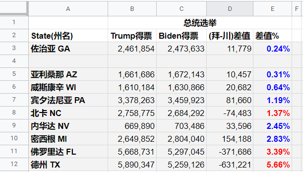 结果最为紧咬的前三个州分别为,佐治亚州(AG, 0.24%),亚利桑那州(AZ, 0.31%)和威斯康辛州(WI, 0.64%)。