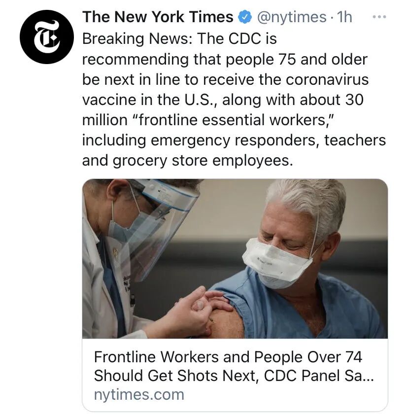 本月初,CDC委员会对疫苗接种的阶段1a进行了投票,建议将最早首发的第一轮疫苗,给医护人员和长期护理机构的居住者(通常都是高龄老人)。该委员会周末再度更新了指南,以13比1的投票结果决定,将把75岁以上老人和前线工作人员接种疫苗的优先级提前,变到首批接种的第二波人群(1b)。