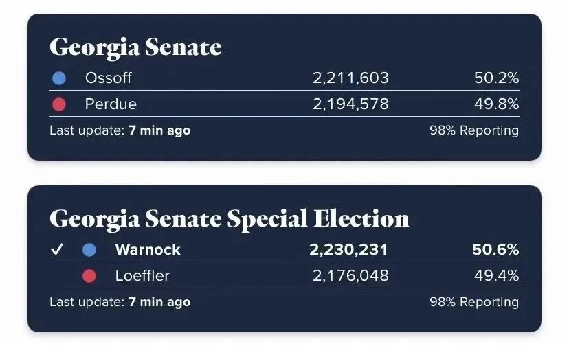今天尘埃落定,GA的两个国会参议员席位均被民主党拿下。这也是历史上最贵的参议员竞选,共耗资8亿美元,对比一下,总统选举一个候选人也不过是10亿美元上下的花费。
