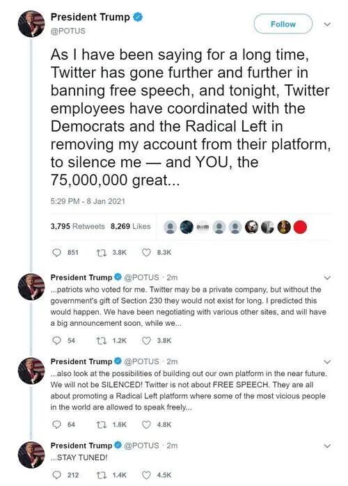被禁以后的川普在parler上的发帖