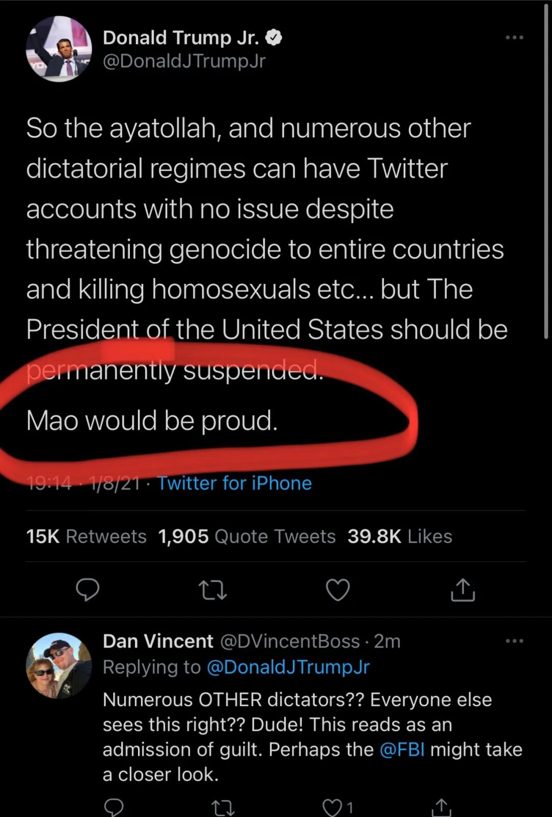川普大儿子也就此吐槽,“多个专制政权的推特账号相安无事,包括一些威胁种族清洗、叫嚣杀死同性恋的号,但是美国总统的号则被永久停号!”