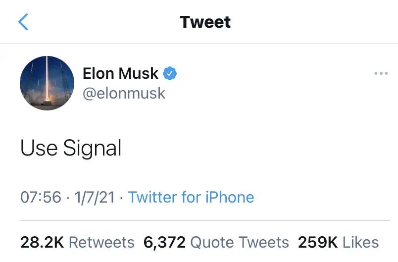 此时,新科首富叫一龙的SpaceX的小马哥思路清晰地发了一个推,“用Signal”(社交媒体APP)。发现美国人遇到大科技企业搞言论禁封时候,方法跟华人社区能想到的也大同小异。