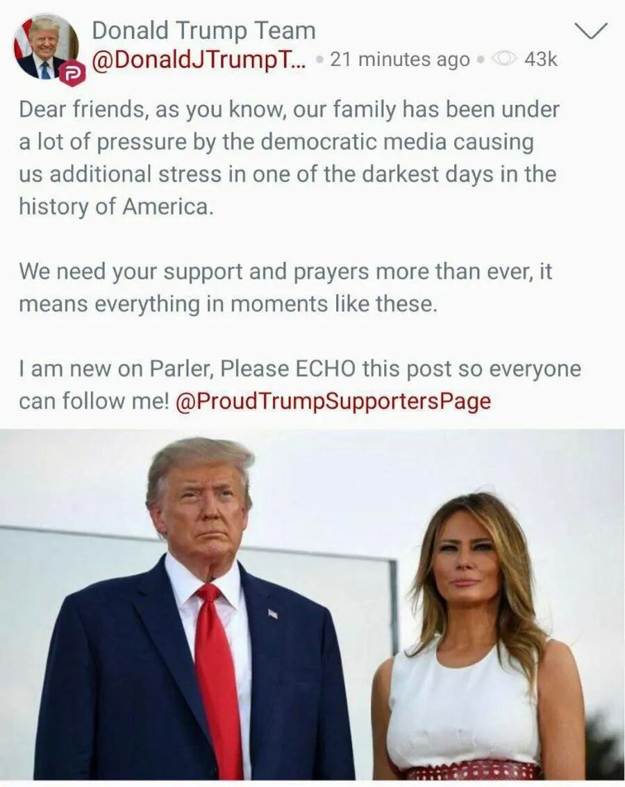 看一下川普新上parler发的第一条消息,透露自己家庭面临巨大的压力。大概就是因为川普发了这一条的原因,parler在没有通知下即被google下架。